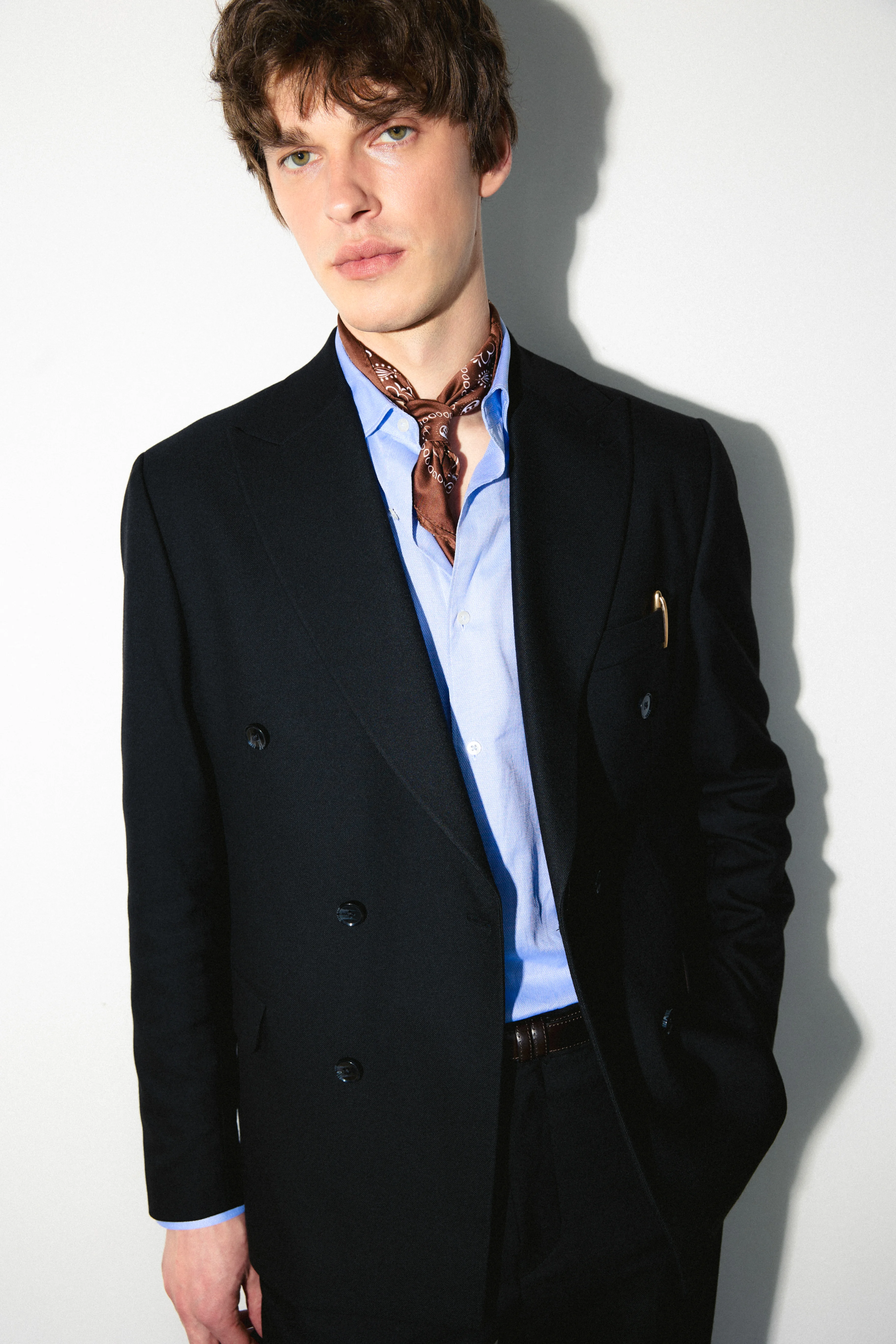 Кишені штанів: Дві бокових кишені, дві кишені позаду з ґудзиками Декор: Англійська шліца / неаполітанський лацкан