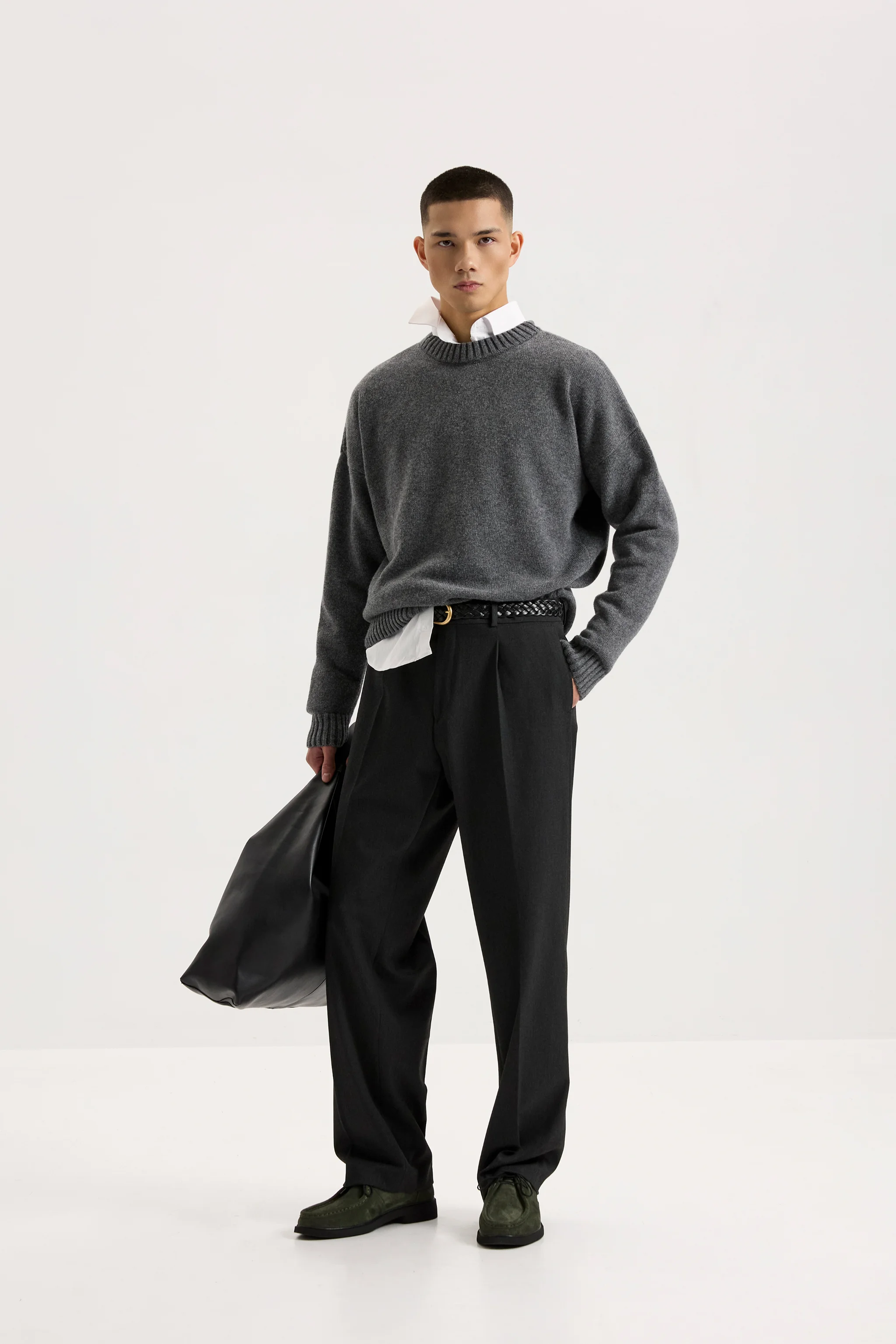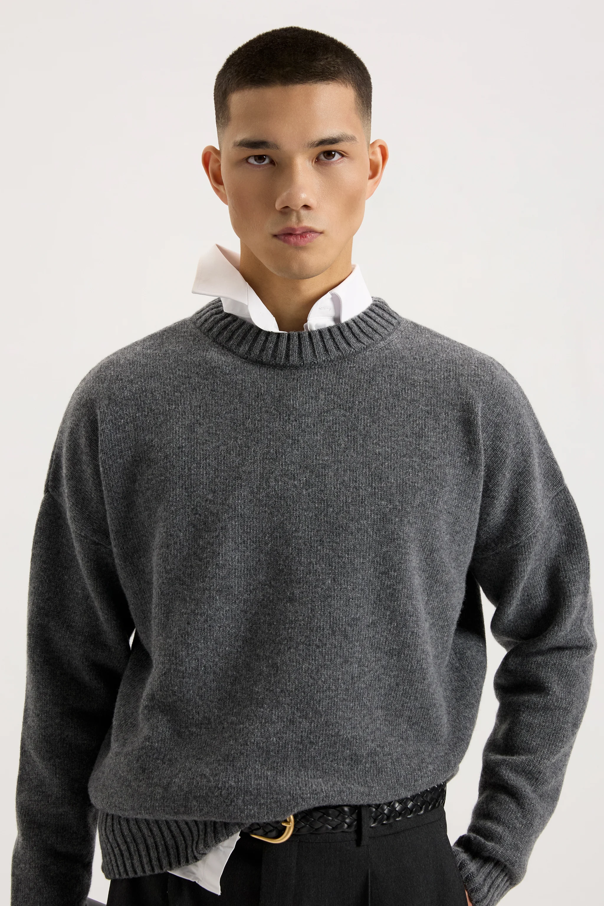 Серед светрів немає більш універсальних, ніж класичний джемпер з круглим вирізом. Цей джемпер оверсайзного крою зі спущеними плечима та вільними рукавами. Він створений із тактильно м'якої вовни та перероблених волокон, які зігріють вас у холодну пору